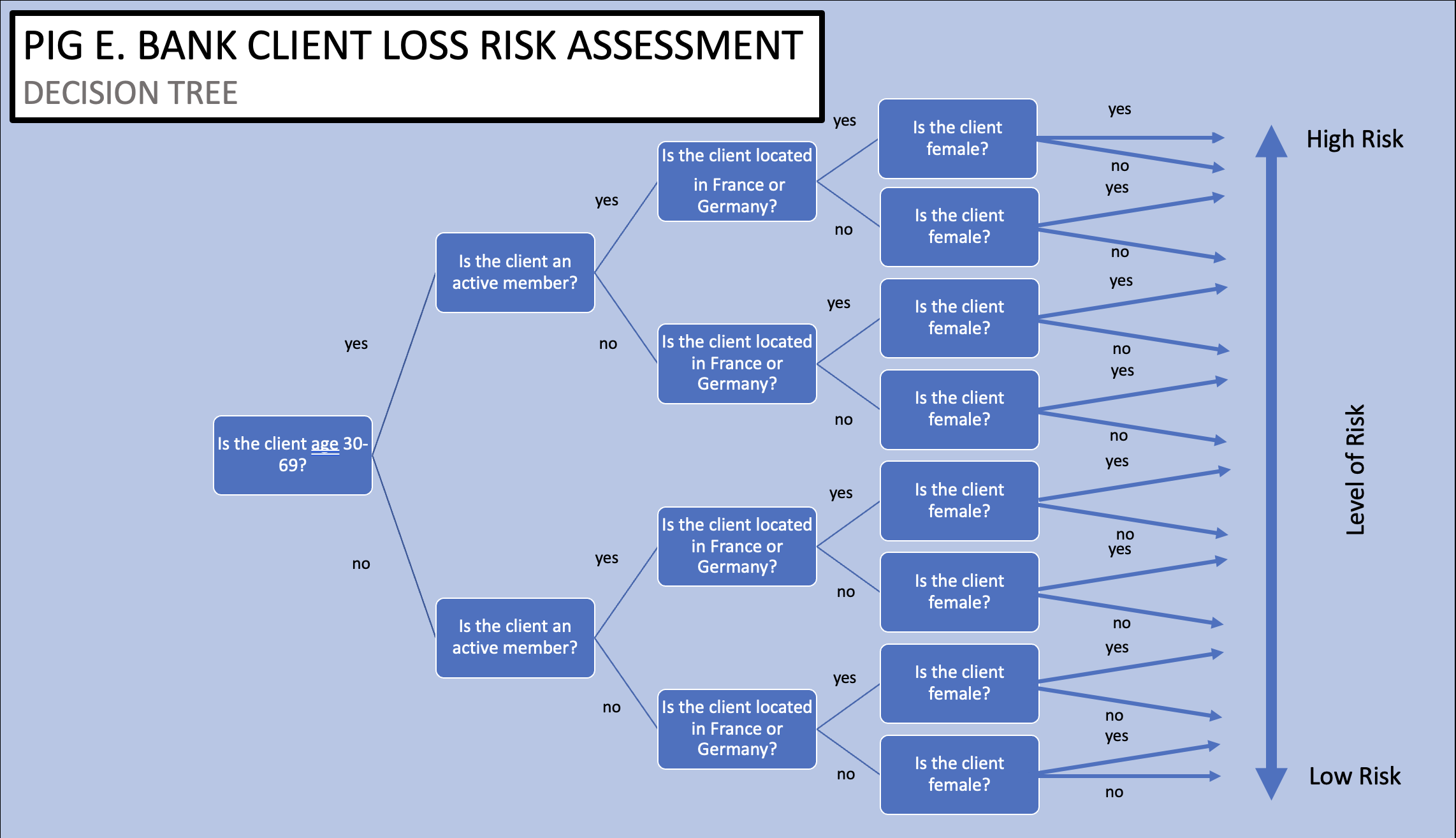 This knowledge was used to uncover leading causes of client loss and identify sources of potential bias, security, privacy, and ethical issues for Pig E. Bank, a fictional global bank.