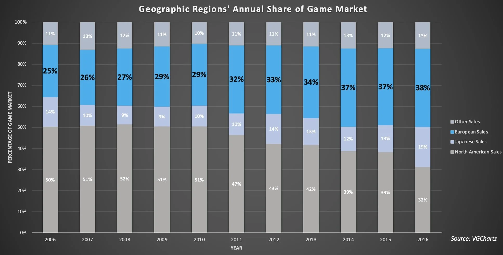Since 2006, annual European game sales have taken up an increasing percentage of yearly sales.