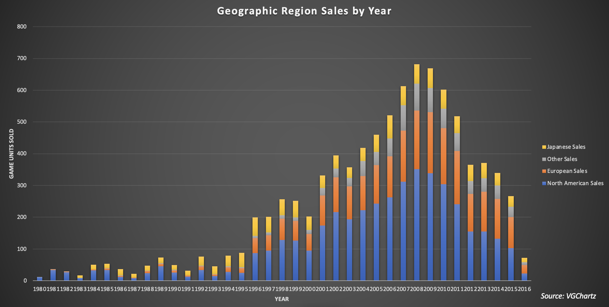 The percentage of total annual game sales each region contributes varies each year, resulting in a variance in total sales.